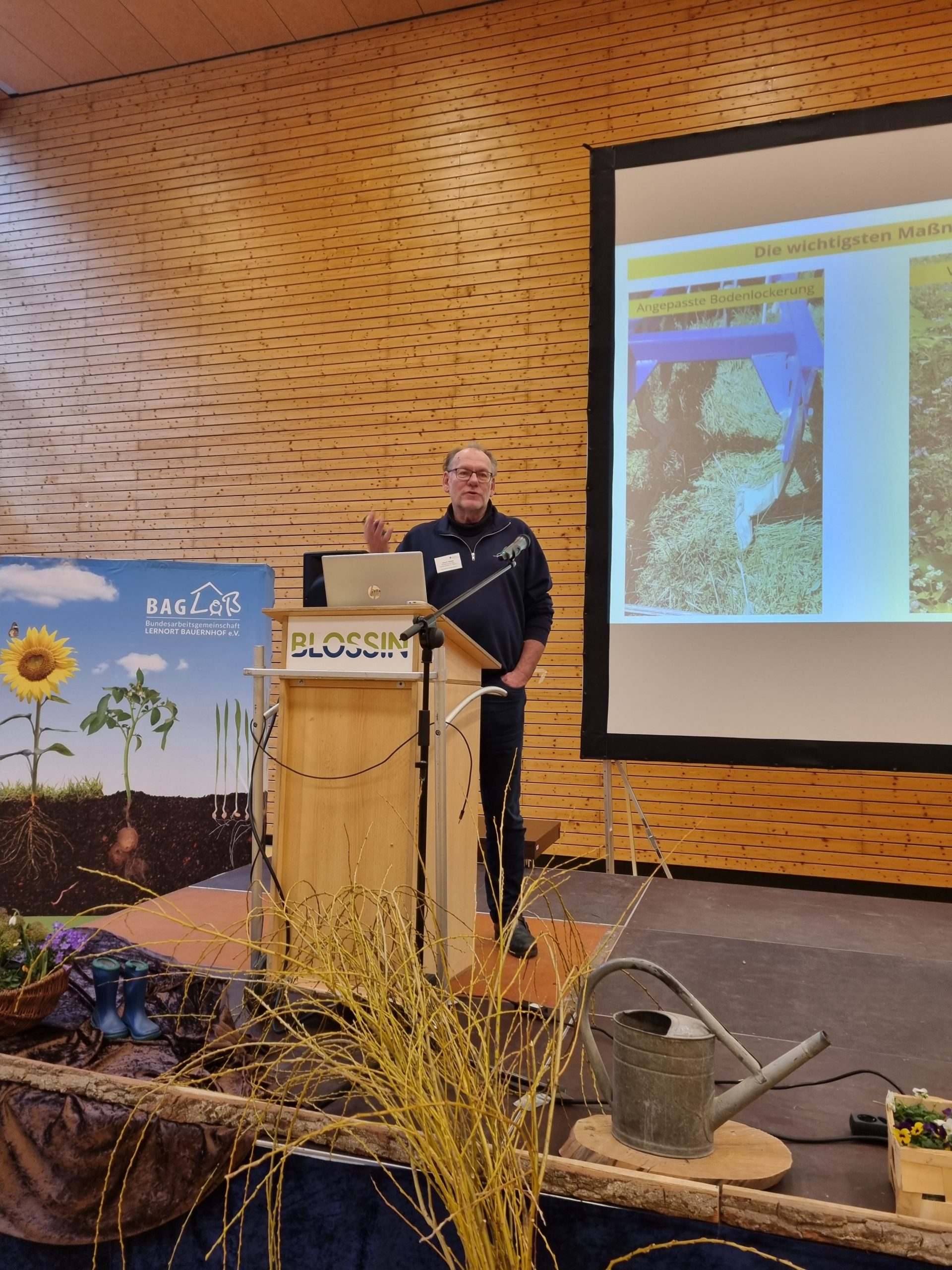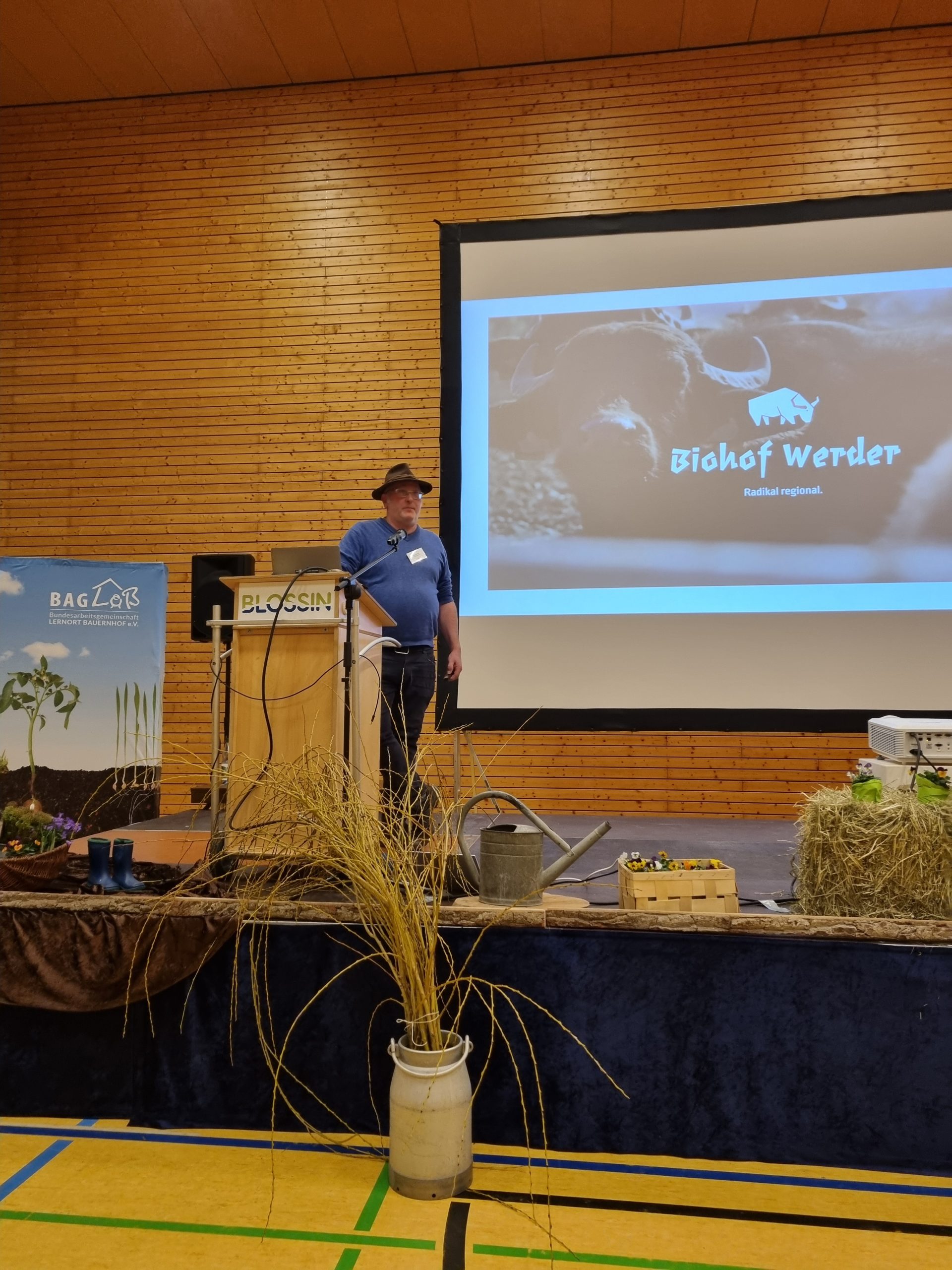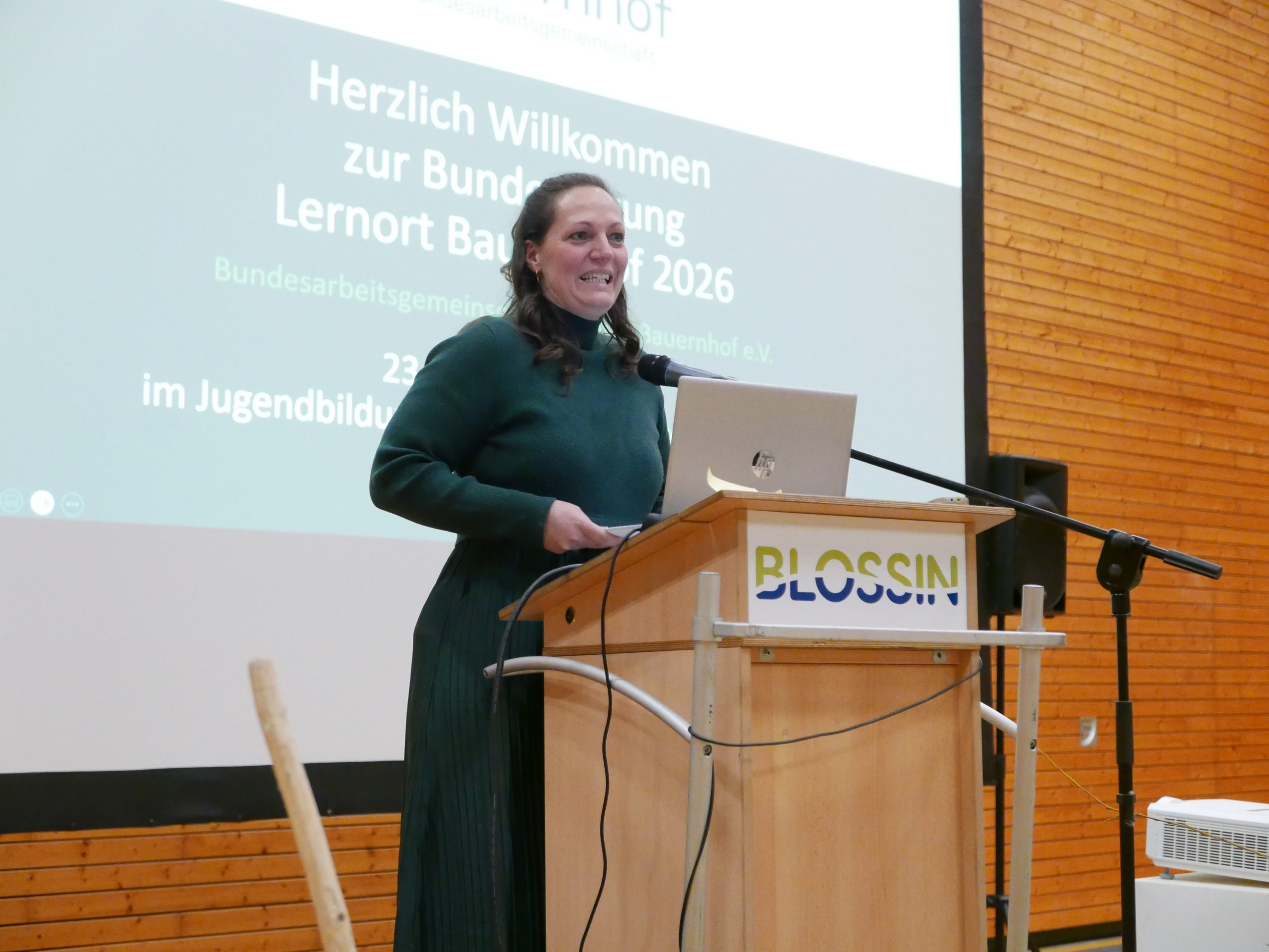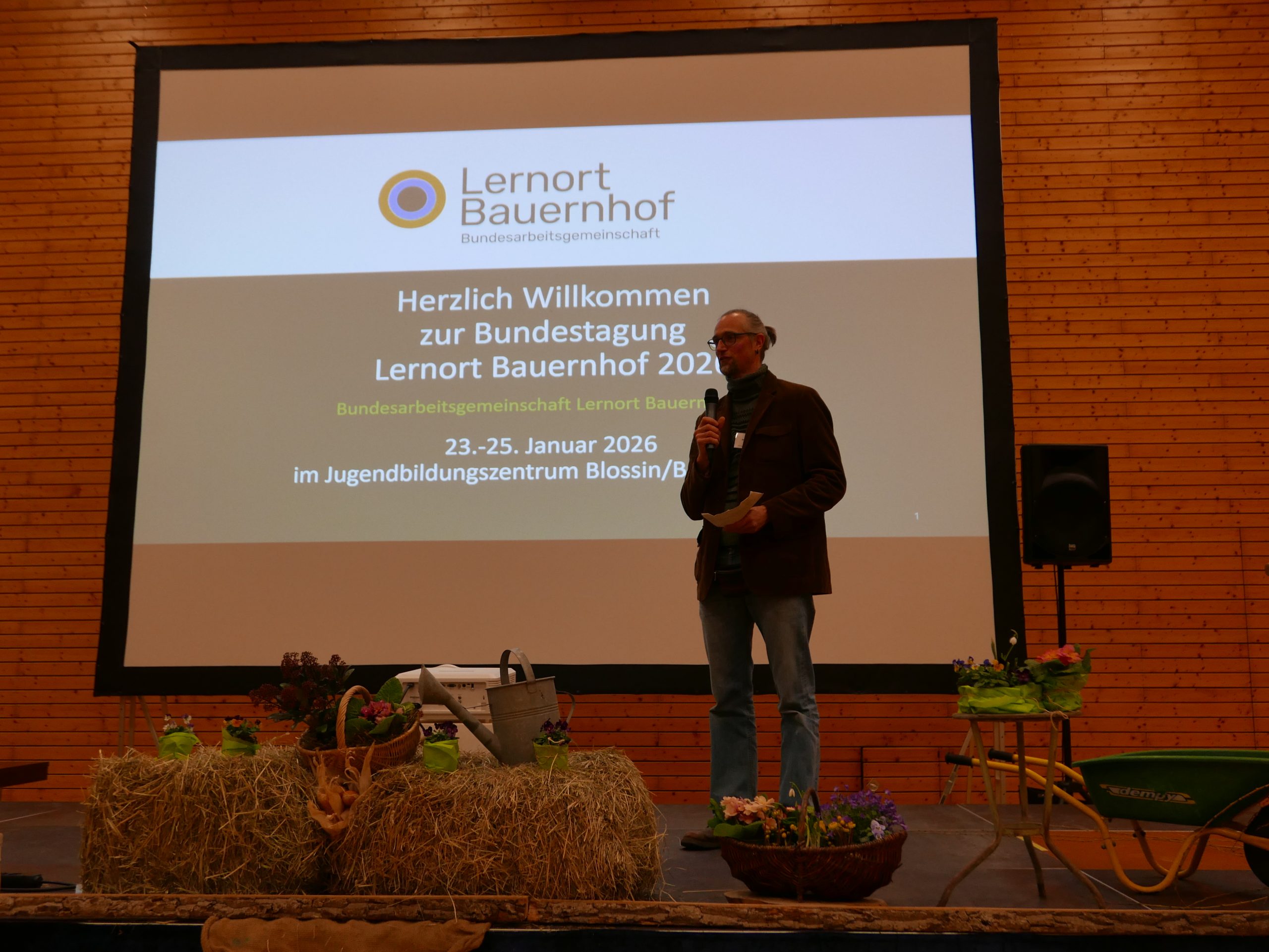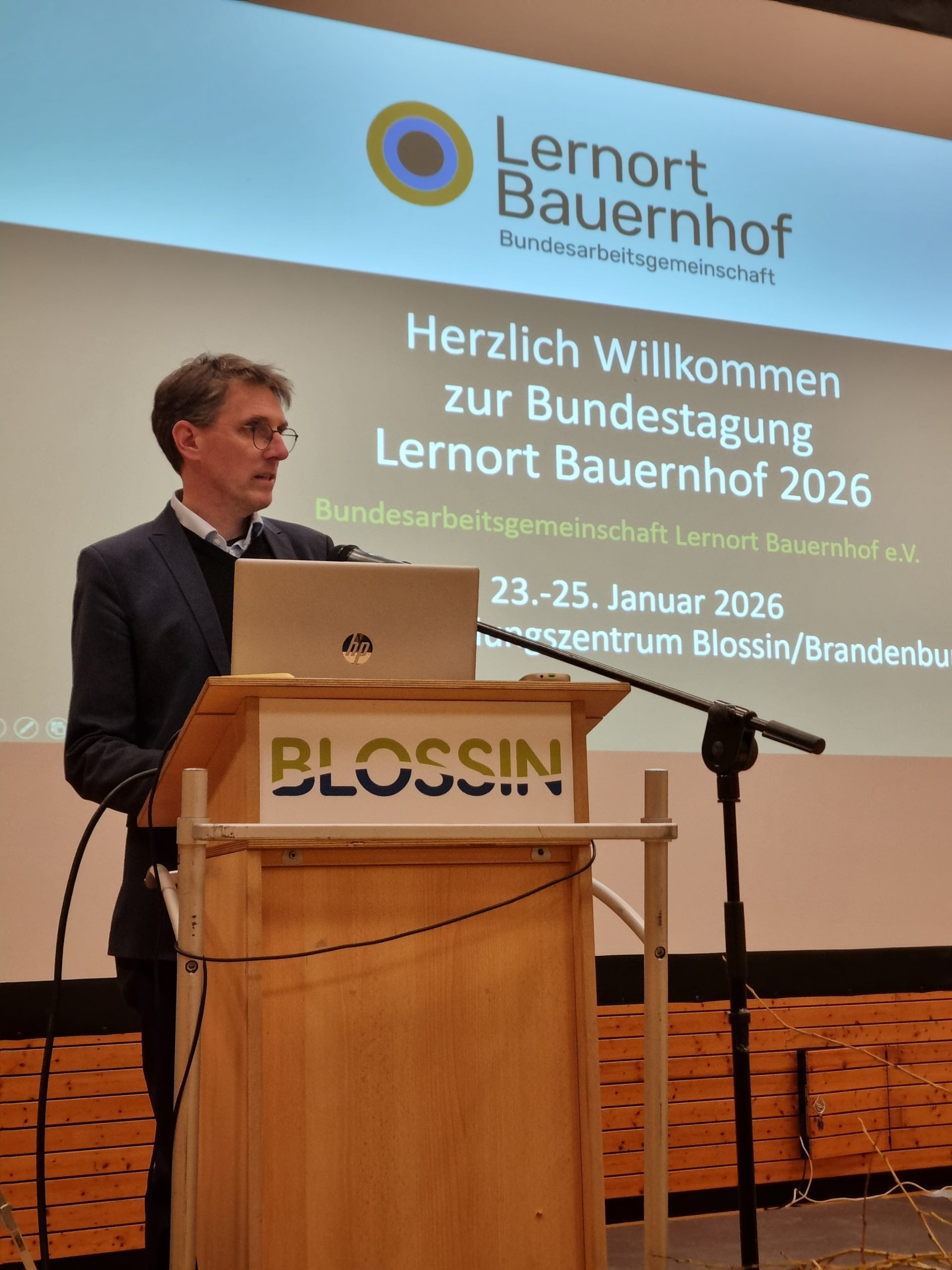 Veranstaltungsort der Tagung war das Jugendbildungszentrum Blossin, das seit vielen Jahren als Ort für Jugend- und Umweltbildung sowie außerschulisches Lernen in Brandenburg etabliert ist und in 2025 als Ort für Bildung für nachhaltige Entwicklung zertifiziert wurde. An drei Tagen wurde den Gästen ein volles Programm aus Vorträgen, Workshops und Vernetzungsmöglichkeiten geboten. Durch den Eröffnungsabend führten die BAGLoB-Vorstandsvorsitzenden Heike Delling und Dr. Malte Bickel, die unter der Fragestellung „Was kann der Lernort Bauernhof und was braucht der Lernort Bauernhof?“ Akteur:innen aus Politik und Praxis zu Wort kommen ließen.