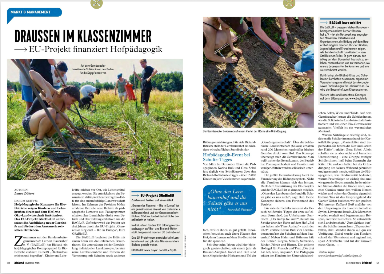27.02.2026 – Das Bioland Magazin berichtet über das “Grenzenlos Regional – Bio in Europa”-Projekt in Zusammenarbeit mit der BAGLoB und die Bildungsarbeit auf dem Lernbauernhof Schulte-Tigges.